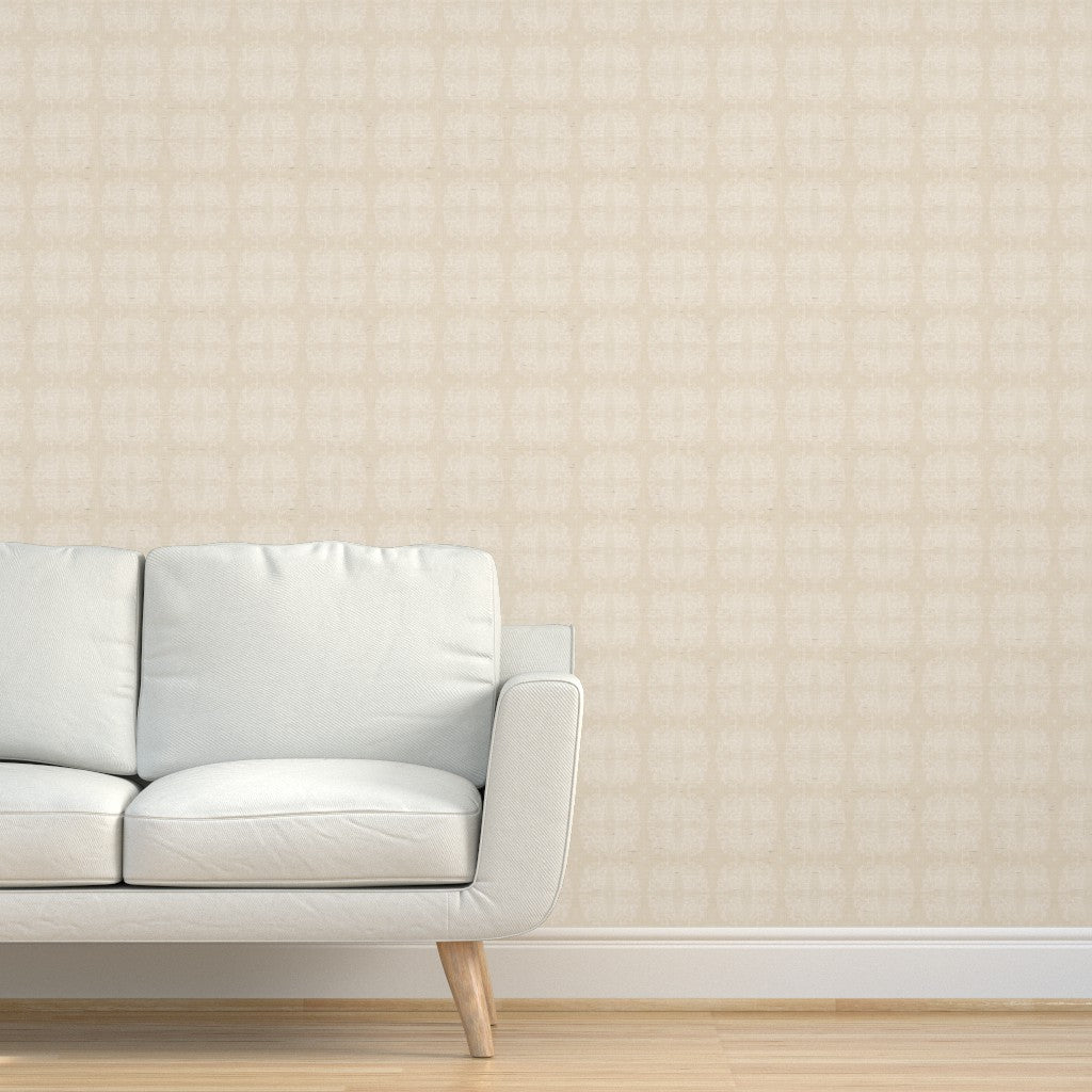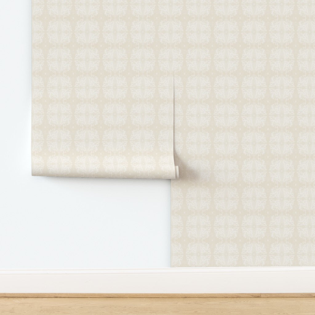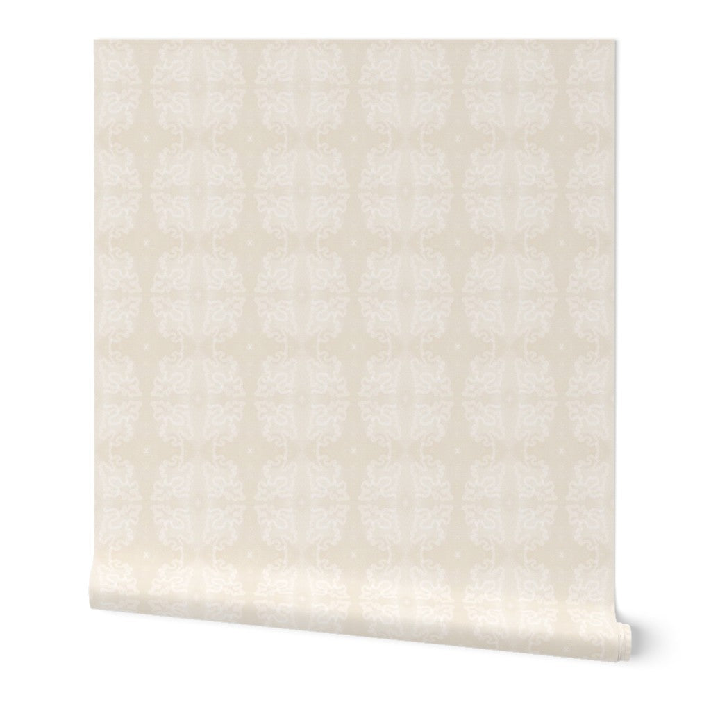 A soft, tonal wallpaper in warm ivory and cream, featuring a subtle repeating motif that feels delicate and airy. The pattern blends gently into the background, creating a light, layered texture that reads almost like fabric or aged plaster. Calm, neutral, and understated, it brings warmth without visual weight.