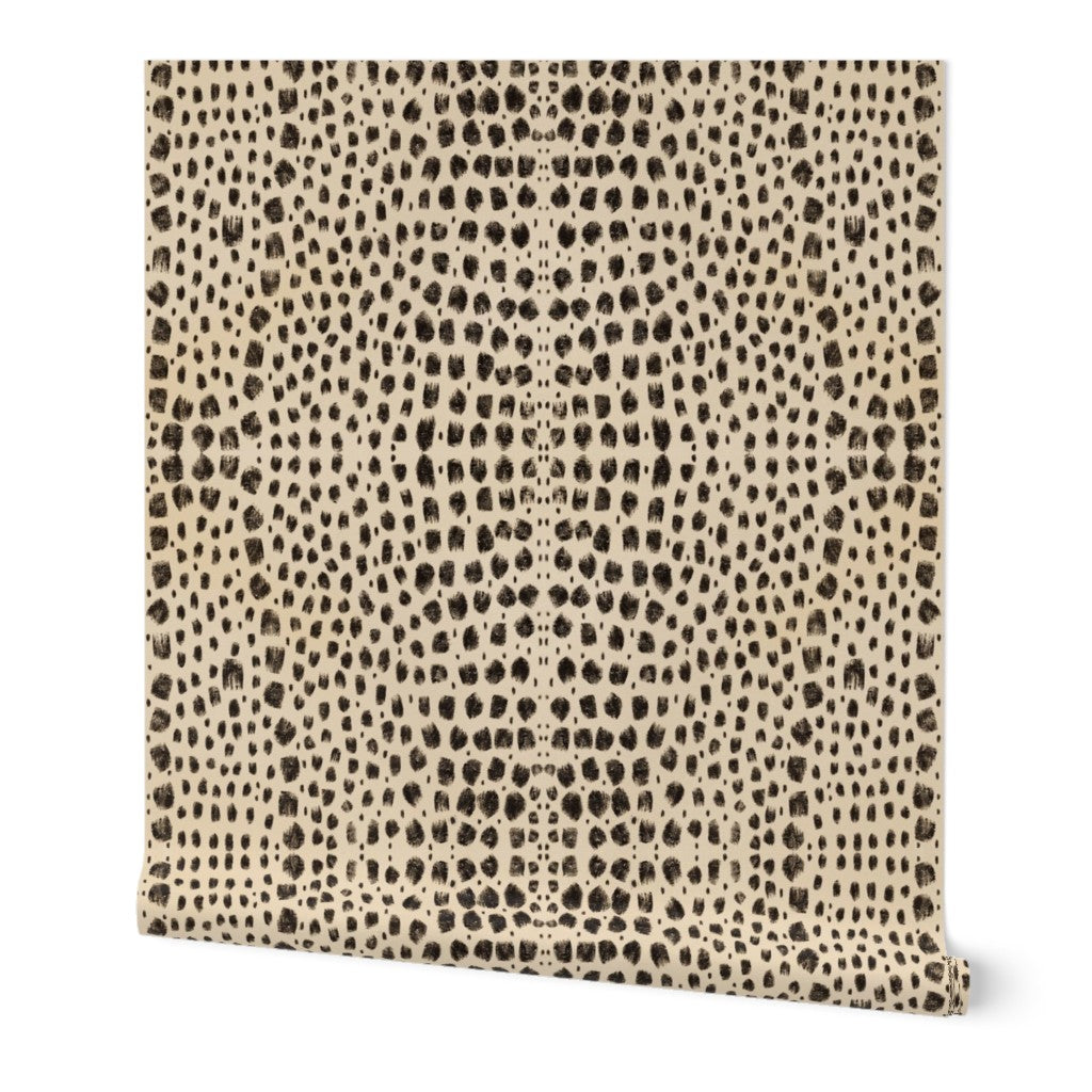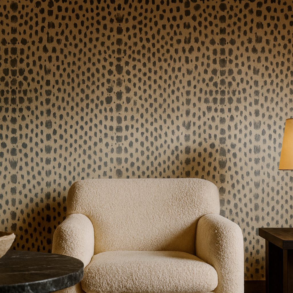 Bondurant Wallpaper blends texture, movement, and soft geometry into a warm, grounded pattern. The sandy background and inky, hand-marked dots create a subtle mirrored cadence across the wall, structured but organic, graphic yet softened at the edges.