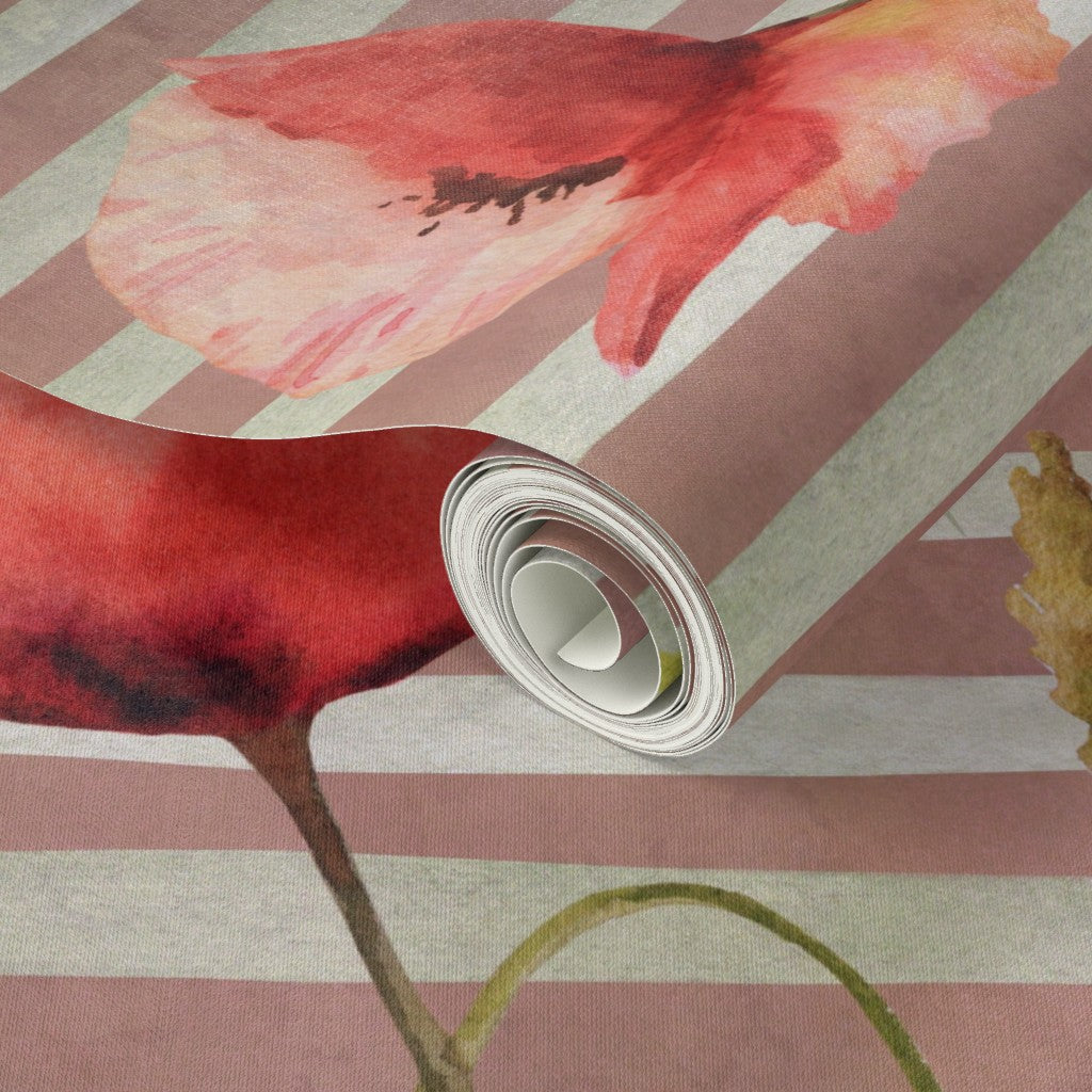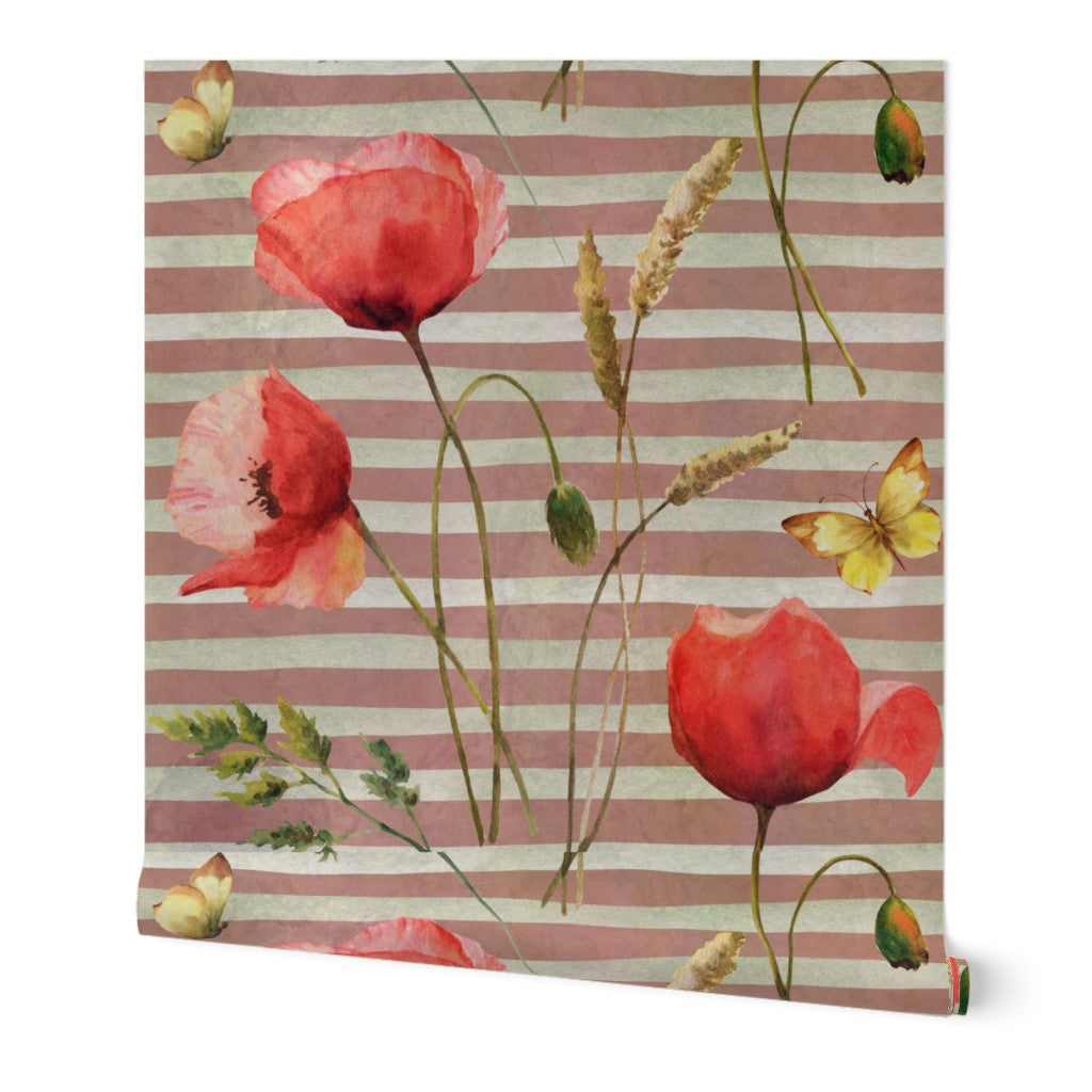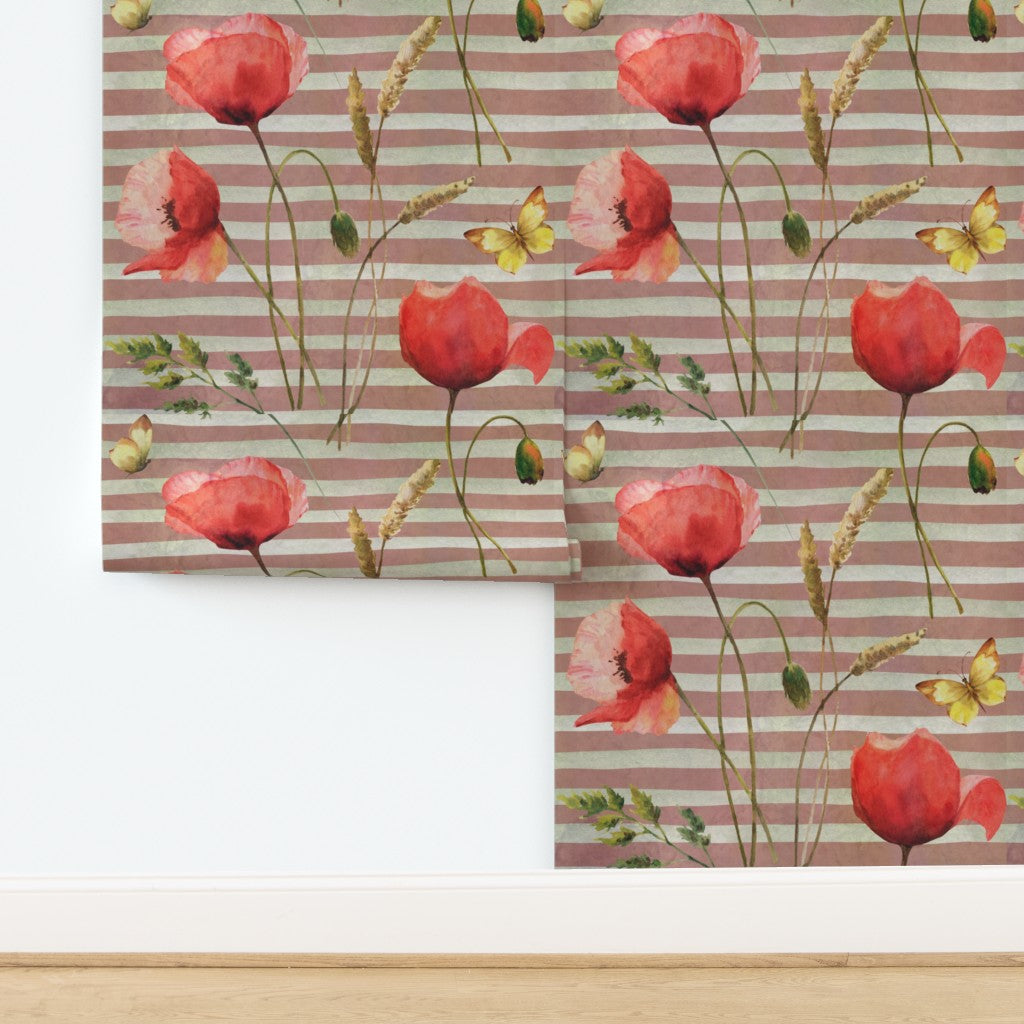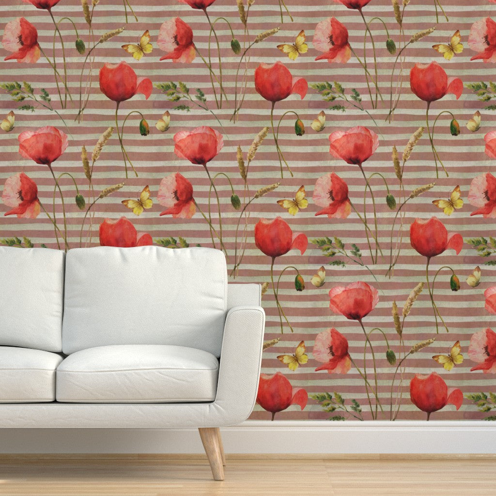 Bring a touch of romance into your home with this painterly wallpaper, where bold red poppies and golden butterflies dance across soft, earth-toned stripes. Perfect for creating a statement wall or enveloping an entire room, this design layers warmth, whimsy, and timeless elegance into any interior.