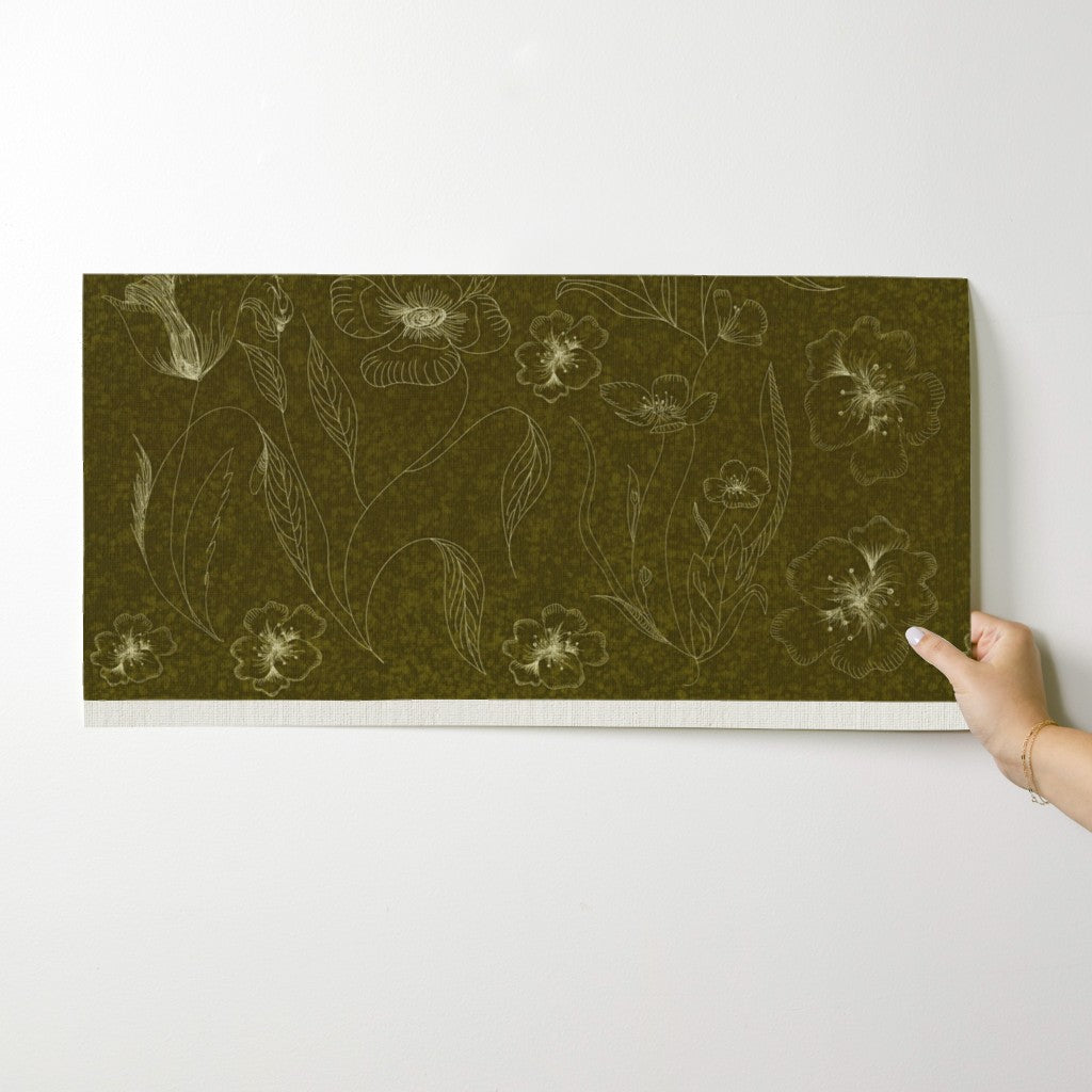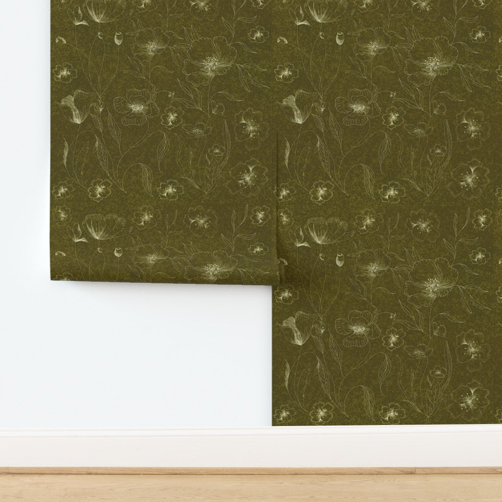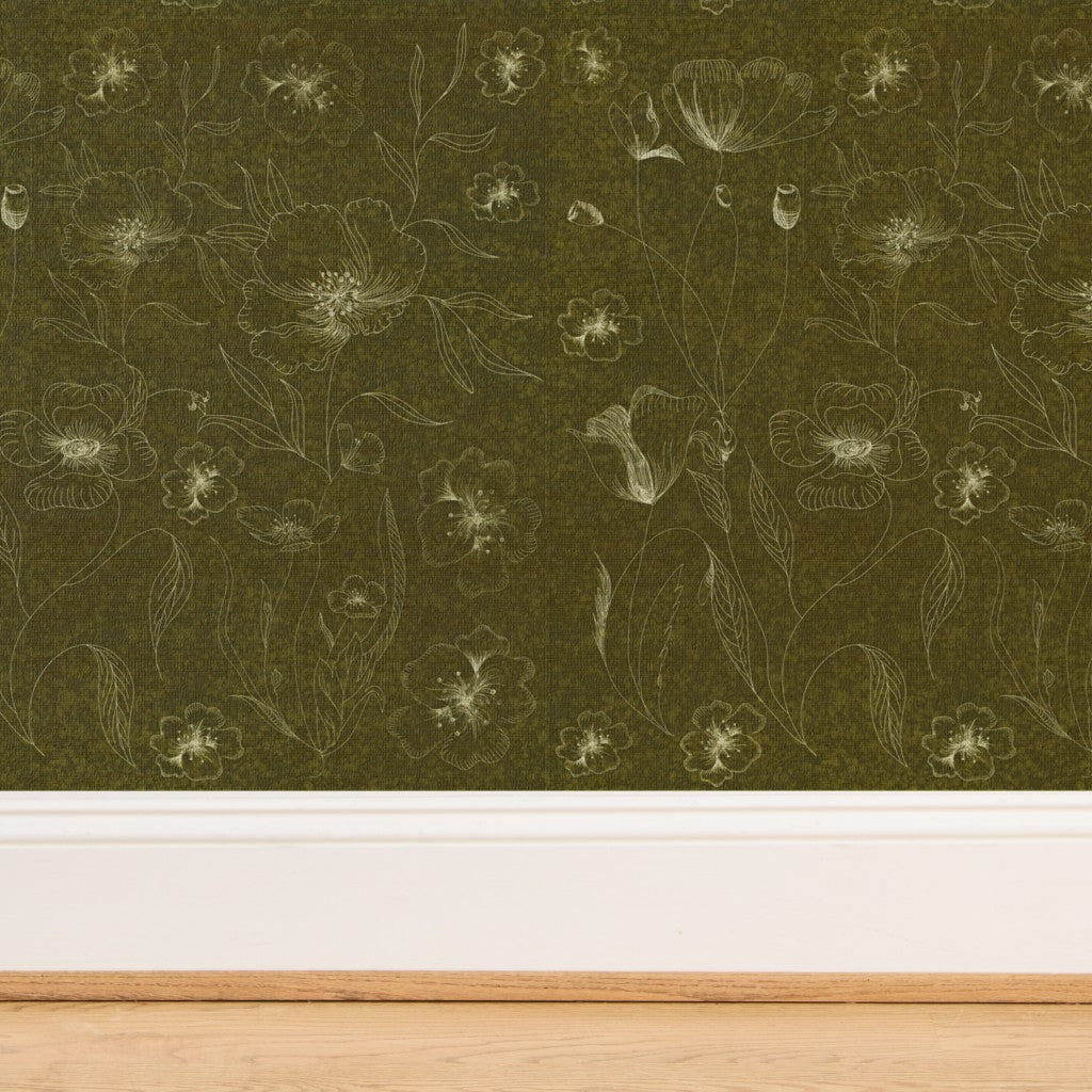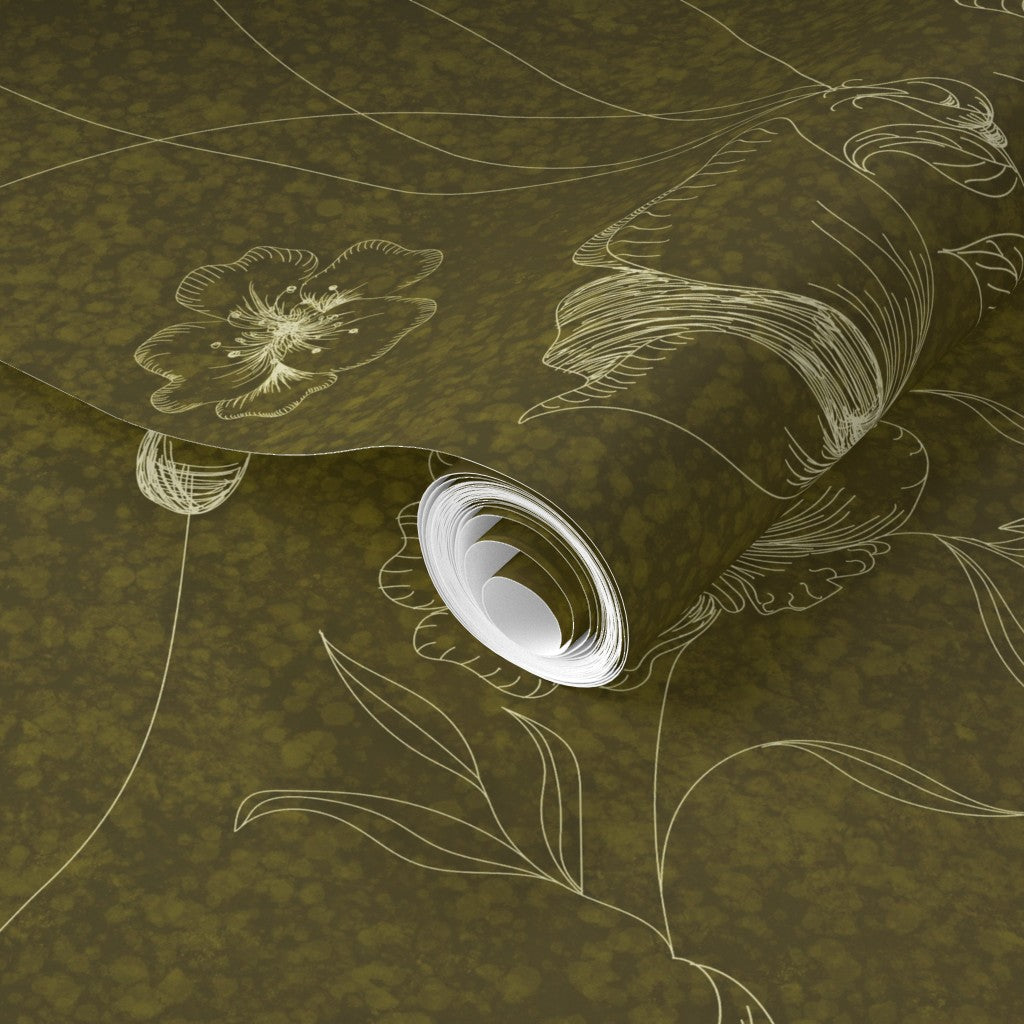 A soft, botanical pattern in warm olive green with subtle golden undertones. Delicate, hand-drawn florals and leaves appear in fine, pale linework, floating across a lightly speckled background. The overall effect is quiet, organic, and atmospheric