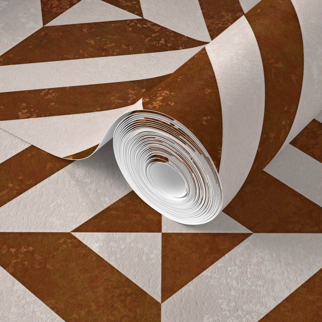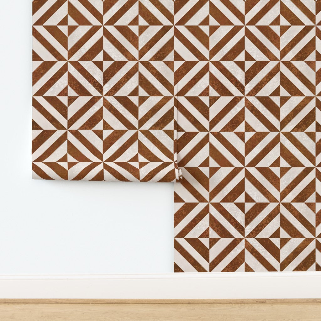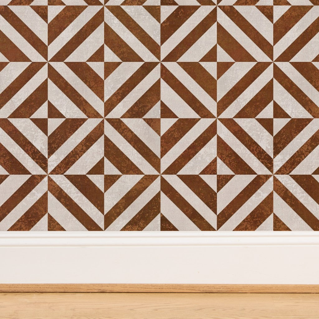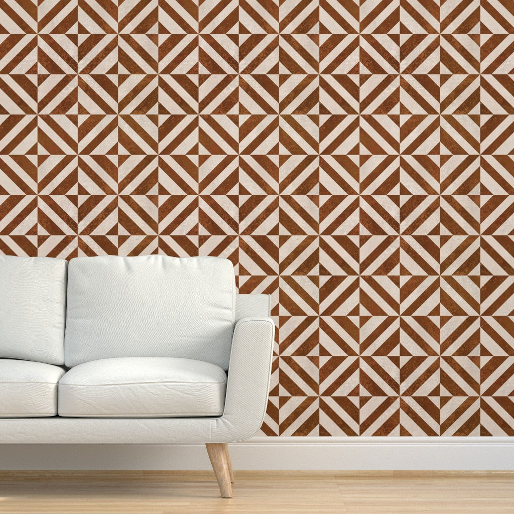 Warm terracotta and soft cream form a striking geometric pattern inspired by hand-laid tiles and natural wood grain. The repeating shapes create balance and movement, giving walls both structure and warmth.