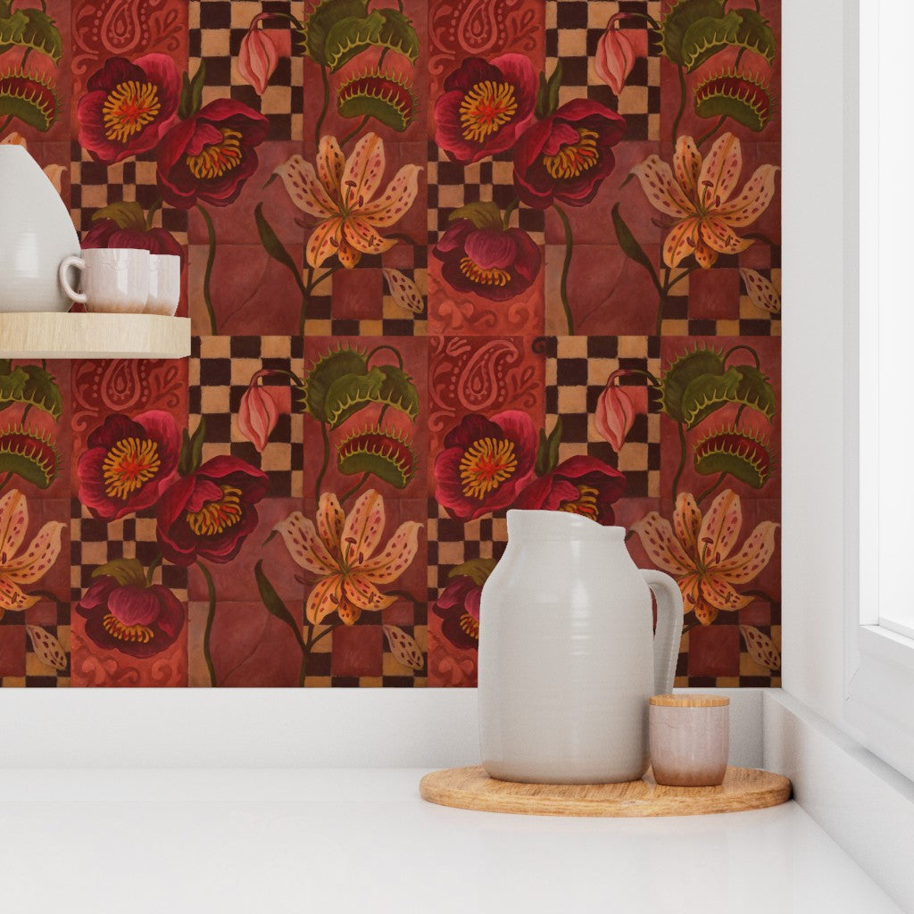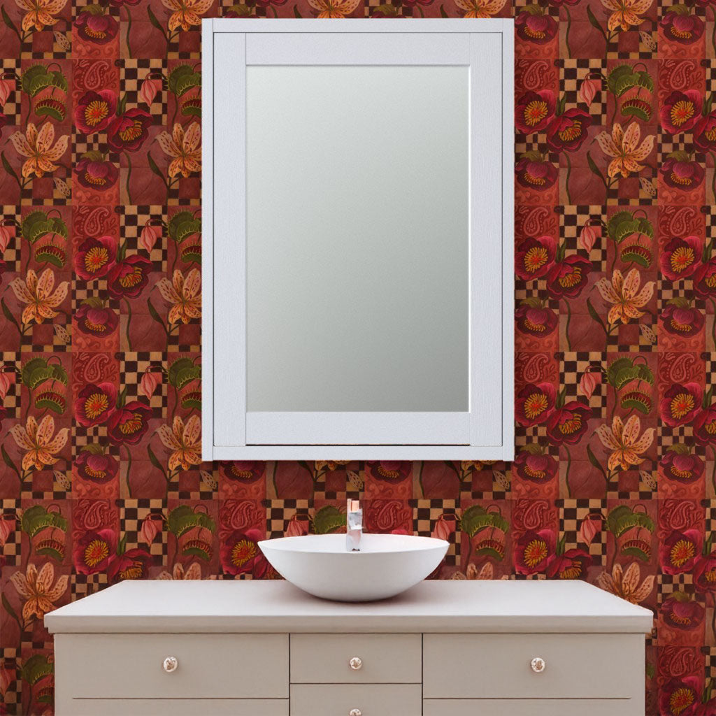 The Skorpios Wallpaper is bold, layered, and unapologetically opulent. A tapestry of florals, paisleys, and checkered motifs unfolds in deep crimson, clay, and golden tones, creating a pattern that feels both historic and avant-garde. Its maximalist spirit calls to mind ornate textiles and garden labyrinths, offering a statement piece for interiors that embrace drama and individuality.